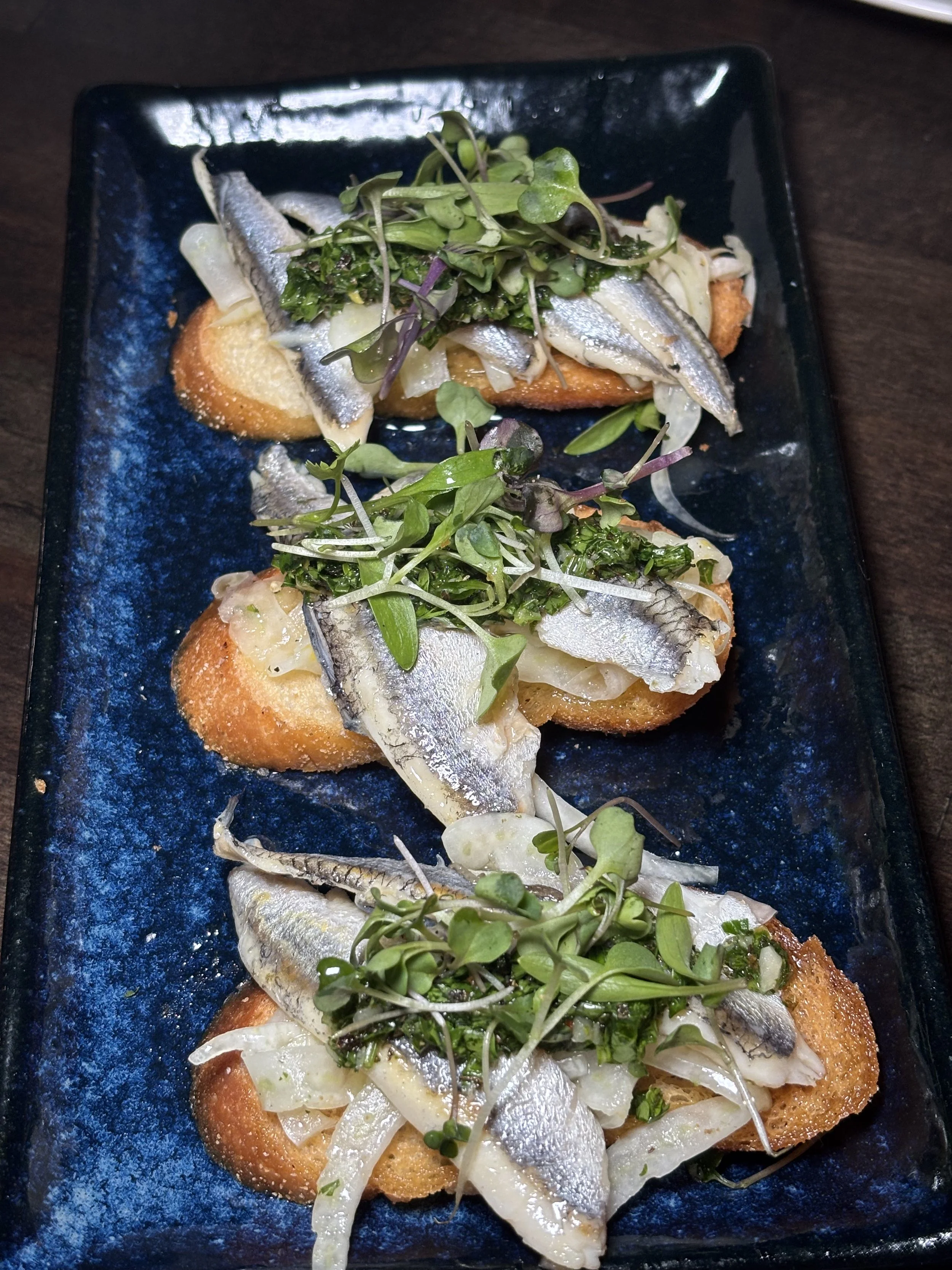Garlic crostini, shaved fennel, boquerones, salsa vert